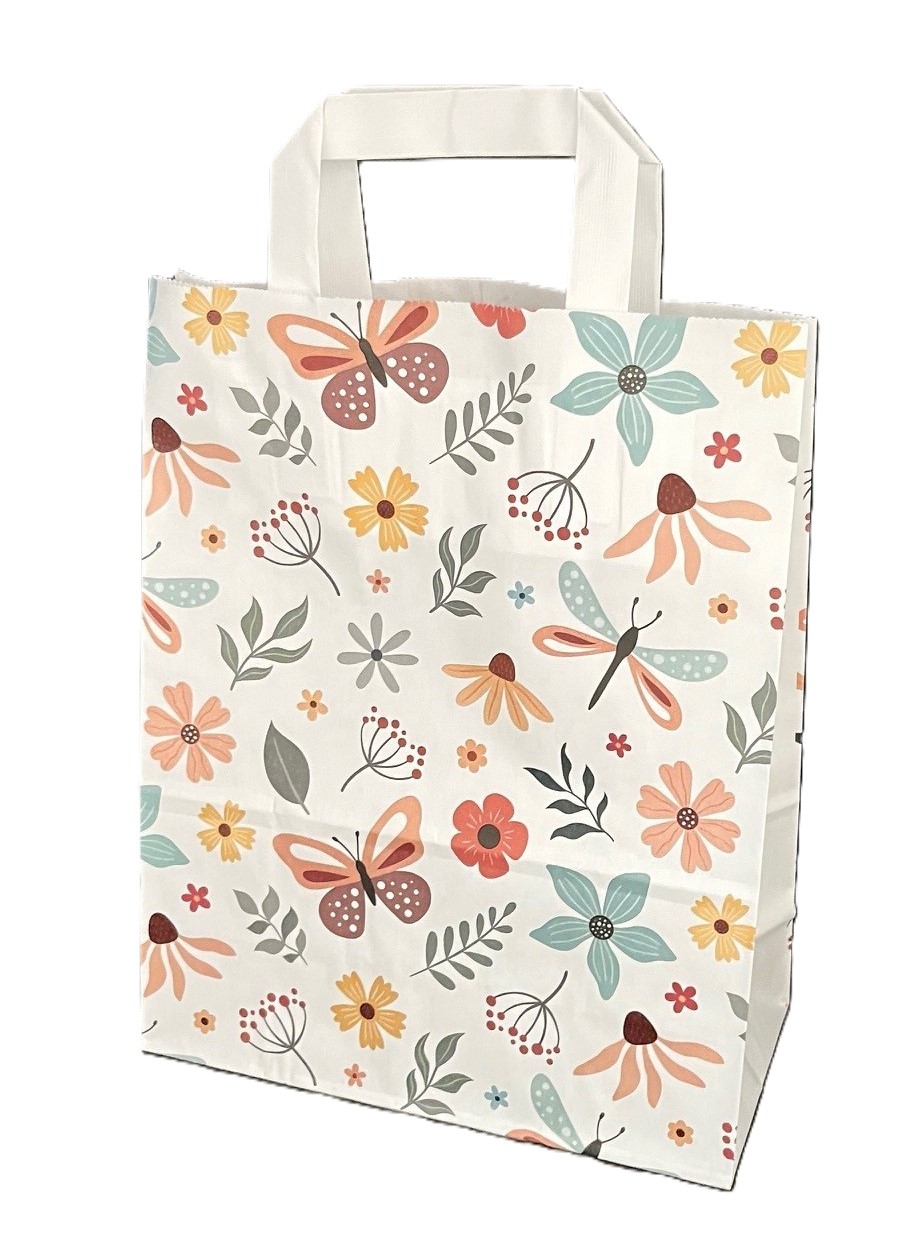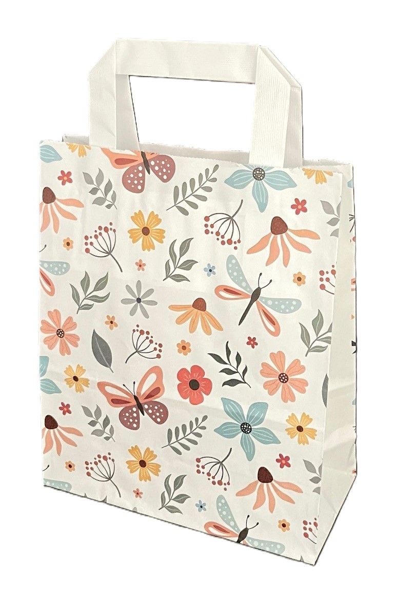 Papiertragetaschen „SCHMETTERLING“, weiß glatt mit weißem Innenflachhenkel